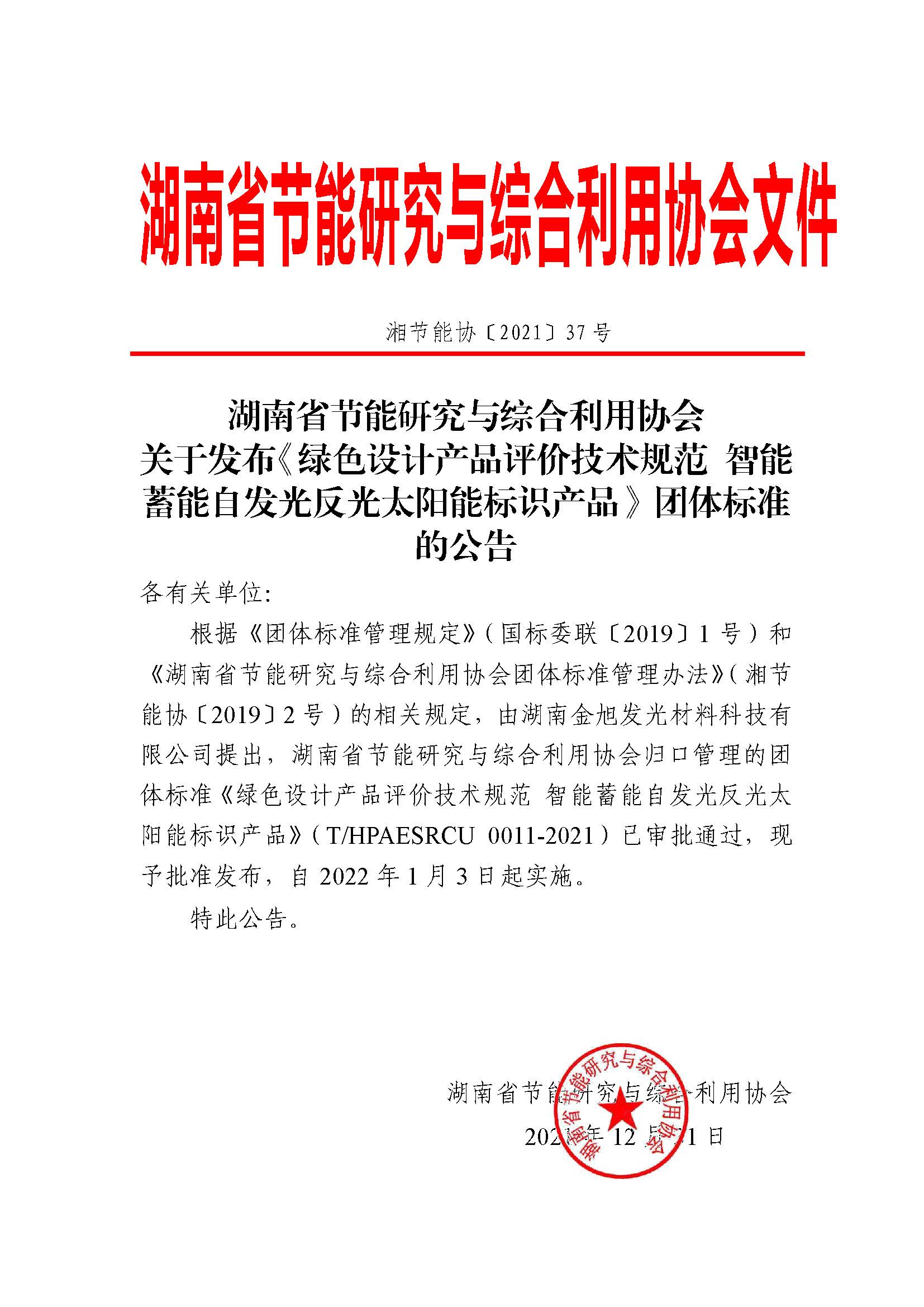 2021年12月,《綠色設(shè)計(jì)產(chǎn)品評(píng)價(jià)技術(shù)規(guī)范 智能蓄能自發(fā)光反光太陽(yáng)能標(biāo)識(shí)產(chǎn)品》團(tuán)體標(biāo)準(zhǔn)正式發(fā)布,于2022年1月3日起正式實(shí)施。
