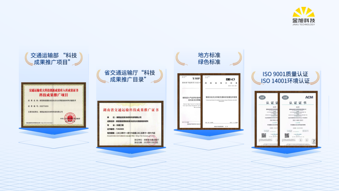智能蓄能自發光反光太陽能交通標識金旭科技產品輻射全省,已在貴州、江西等地示范推廣?,F已成功應用于農村公路(通景公路)、國省干線交通安全設施精細化提升工程、國省干線“美麗示范公路”、高速公路服務區等,應用里程已超2000公里。